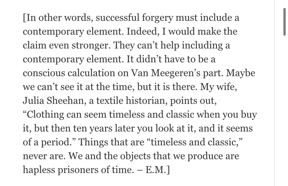 @litherland there’s an old errol morris piece on the nyt about a vermeer forgery that i always think about neutrality or timeless design which calls out how much anonymity is influenced by the norms and invisible themes of a time. because morris is so concerned with Truth as a concept its an interesting series to read because it’s so much about how we project ourselves onto these concepts than any objective qualities.