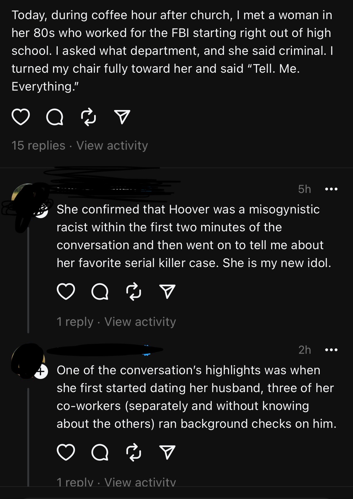 i finally hopped over to threads after not looking at it since launch day and, just want to be clear, i don’t think these people are lying but there are a ton of posts that are engagement-bait stories like “am i the oooonly one that does…” or what i will lovingly call “tall tales”