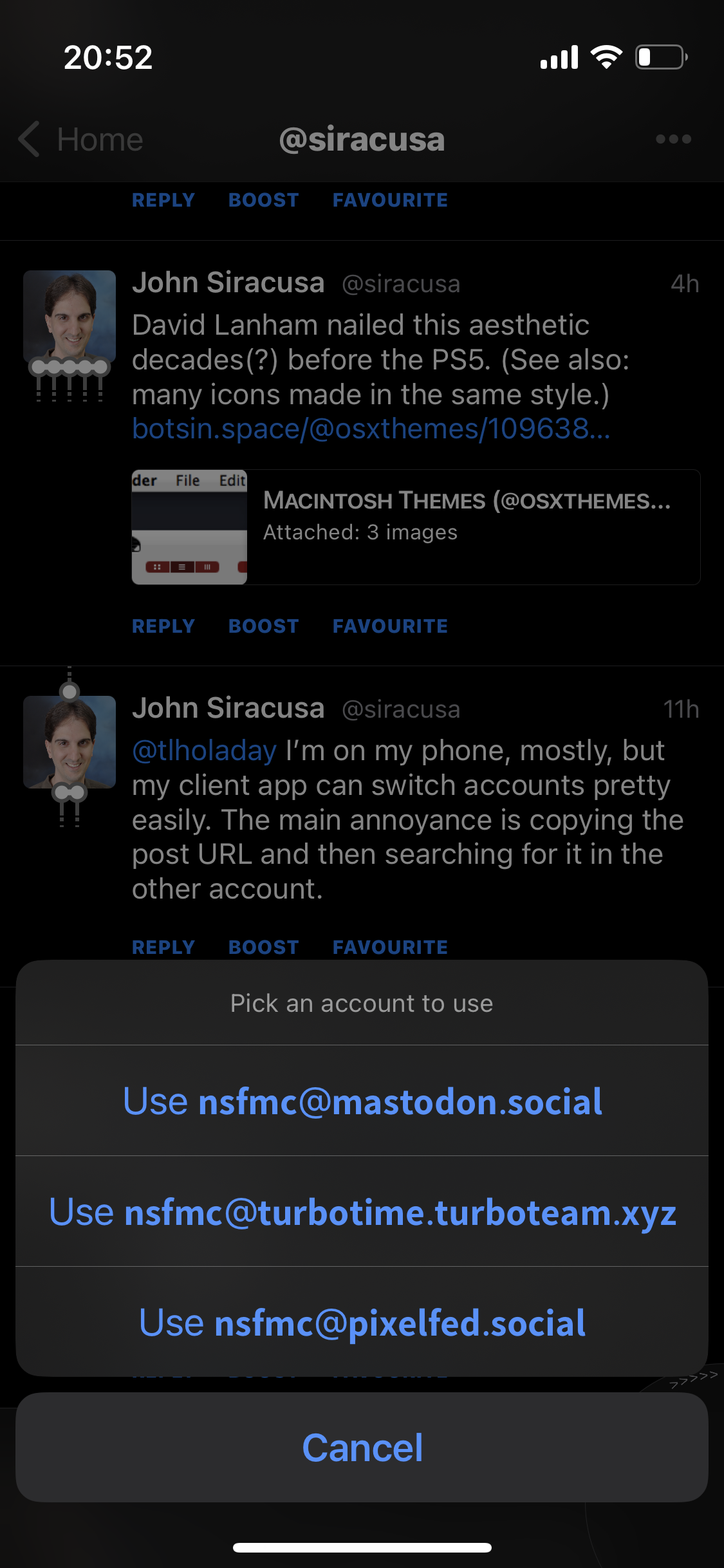 @siracusa@tlholaday guessing hundreds have mentioned but in toot! you can long press on reply/fav to change the acct you perform the reply/fav as, im doing it right now